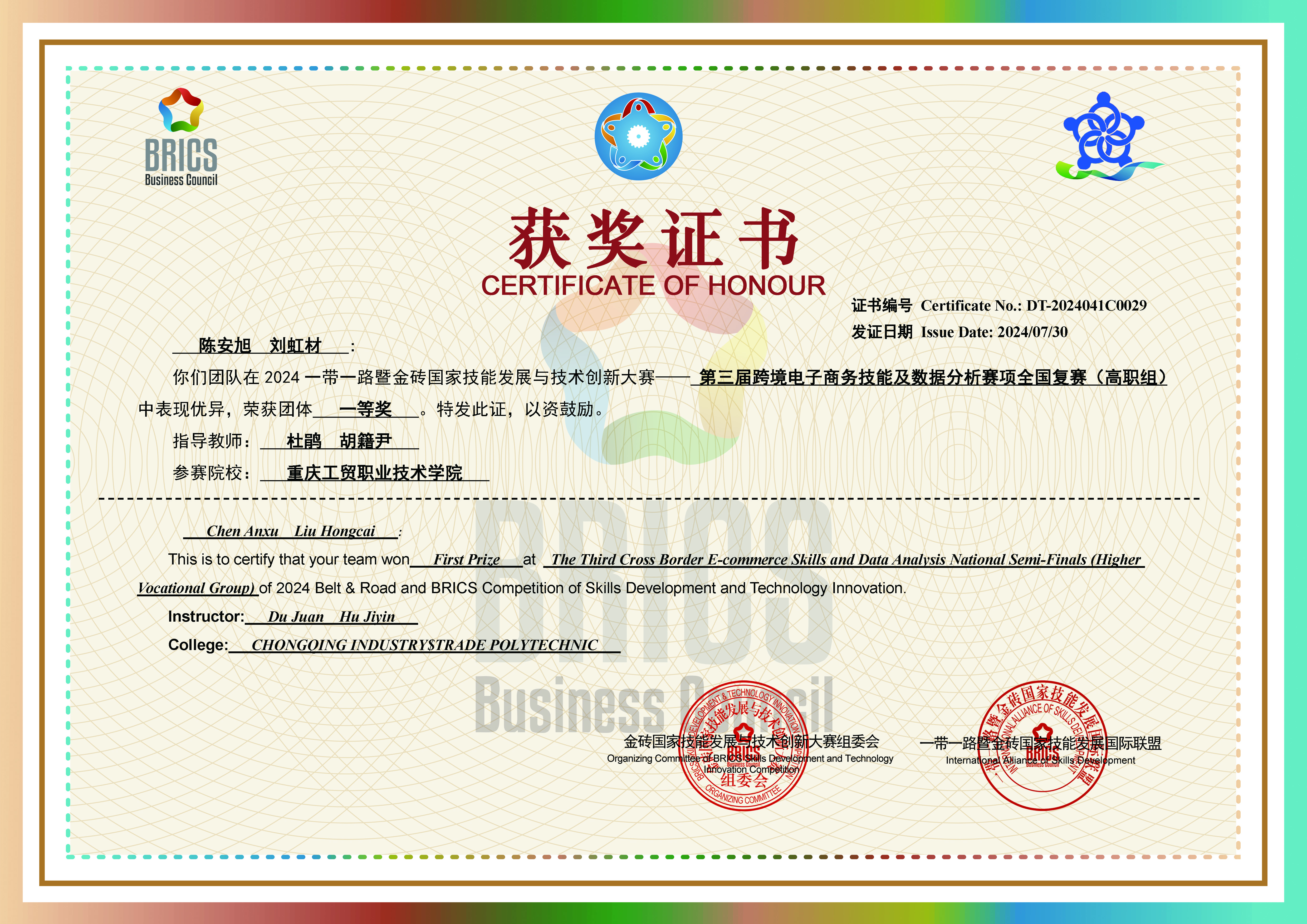 由金砖国家工商理事会中方理事会、一带一路暨金砖国家技能发展国际联盟、中国科协“一带一路”暨金砖国家技能发展与技术创新培训中心主办,中国发明协会、教育部中外人文交流中心等单位联合主办的2024“一带一路”暨金砖国家技能发展与技术创新大赛之第三届跨境电子商务技能及数据分析赛项全国总决赛(高职组)在浙江台州科技职业学院举行,财经学院由苏会、龙光琼、陈安旭、刘虹材等4名学生组成的两支代表队参加全国总决赛,荣获两个三等奖(指导老师:杜鹃、胡籍尹),由朱雪琴、余霜杭等两名学生组成的代表队荣获优秀奖(指导老师:杜鹃、曾贵华)。