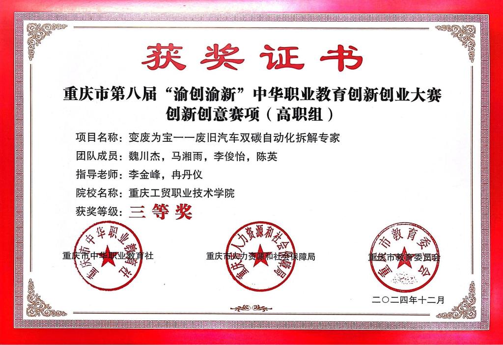 本次大赛由重庆市中华职业教育社、重庆市人力资源和社会保障局、重庆市教育委员会、重庆市江津区人民政府联合主办。赛事历经4个月,全市79所院校、40万余名师生踊跃参与。我校经过反复打磨,积极备赛、沉着应赛,最终我校的《智涂科技》和《油然而生》项目荣获大赛二等奖,《守护之眼》、《变废为宝》、《聚胶新材》和《推陈出新》项目荣获大赛三等奖。