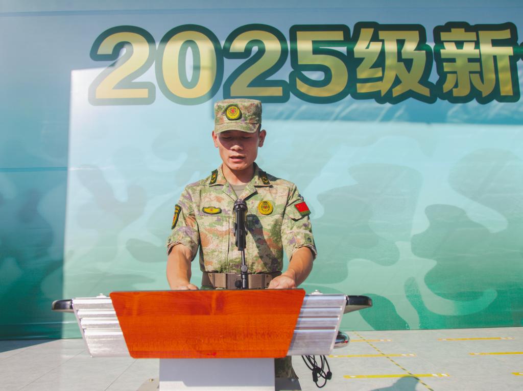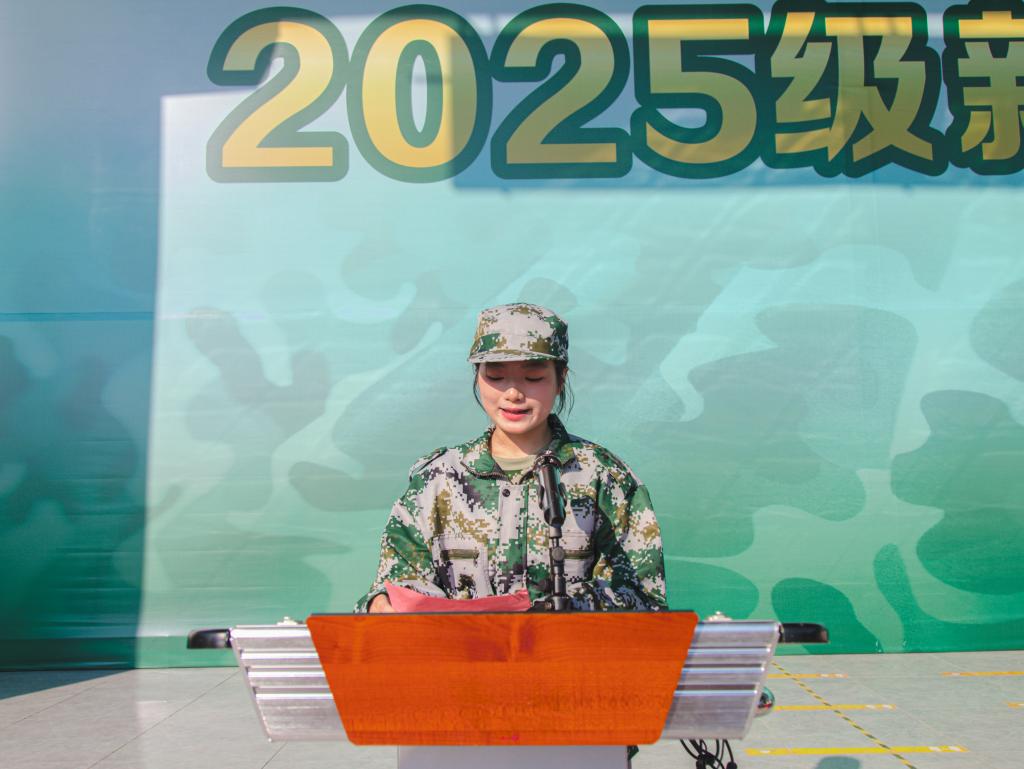 2025级新生代表、教育学院龙子仪同学发言。她表示,军训是一次用汗水打磨意志、用纪律校准方向的蜕变,号召同学们珍惜军训机会,以饱满的热情和认真的态度投入训练,在集体中锤炼作风,在坚持中收获成长,交出一份让自己骄傲、让大家满意的青春答卷。