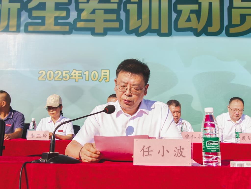 任小波宣读《重庆工贸职业技术学院2025级学生军训团组织编成及干部名单》。