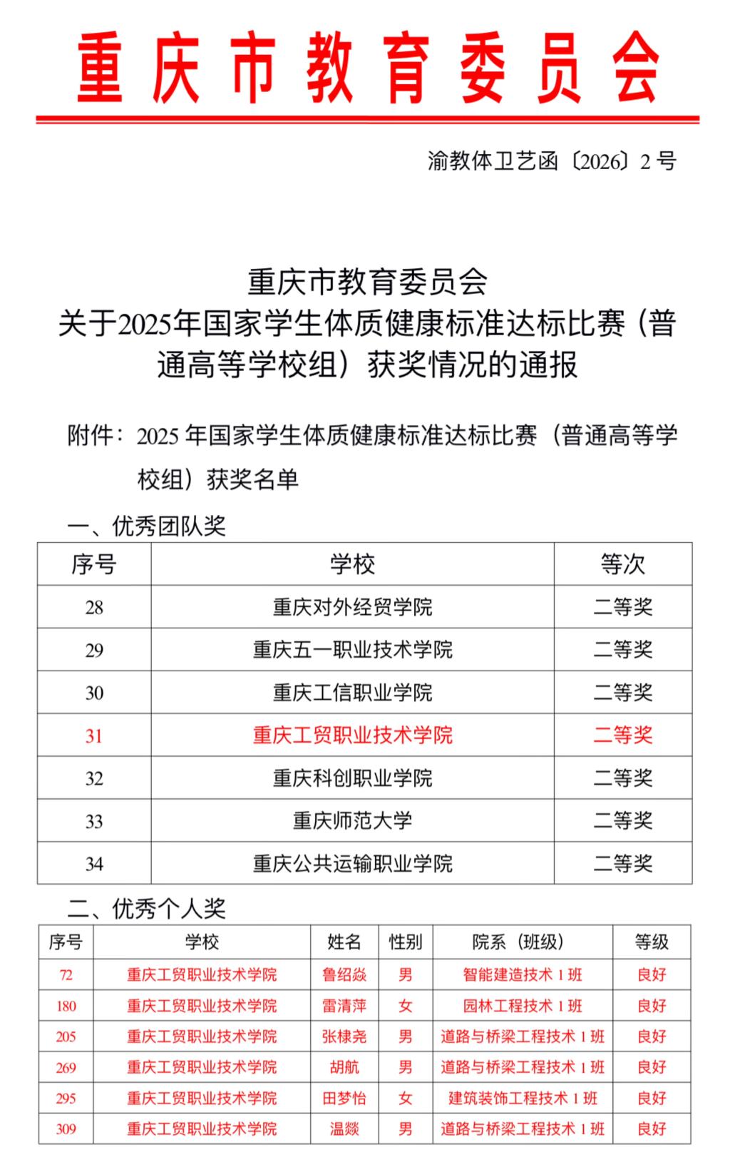 近日,由市教委主办、重庆第二师范学院承办的2025年国家学生体质健康标准达标比赛(普通高等学校组)在重庆第二师范学院顺利结束。经过参赛学子的努力拼搏,我校荣获优秀团队二等奖。在优秀个人奖中,我校建筑工程学院鲁绍焱、雷清萍、张棣尧、胡航、田梦怡、温燚等6名同学凭借出色的体能表现和顽强的拼搏精神,荣获良好等次,体现了工贸学子昂扬向上的精神风貌和良好的体质健康水平。