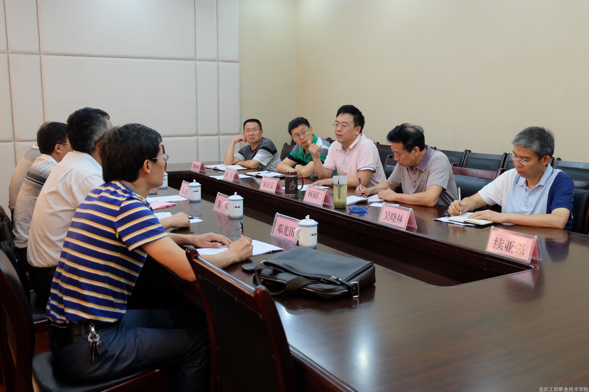 对口交流座谈会上,重庆幼儿师专陈丕书记和我院宋正富院长分别介绍了各自的办学情况,双方就决策监督、二级管理、绩效工资考核发放、内部审计、教代会运行等进行了全面深入的交流。学院党委副书记、纪委书记何福仁及党政办公室、纪委(监察审计处)、组织人事处、工会负责人参加了对口交流座谈会。会后,何福仁书记陪同客人参观了生物化学工程系实训室。